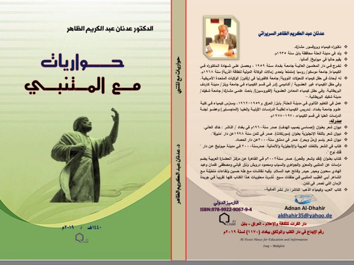 والكتاب يقع في: الجزء الأوّل بعنوان "جدل على ضفاف دجلة والفرات"، والجزء الثّاني بعنوان "المتنبي في ميونخ"، وجزء بعنوان "المتنبي ودولة الخاروف الأسود"، وجزء بعنوان "في بريطانيا". وهذه الأجزاء تضجّ بتفاصيل متخيّلة مع المتنبي بما تحمل آراء د. عدنان الظّاهر وأفكاره ونقده ومحاميل عالمه وأسفاره بشكل ممتع يدلّ على سعة اطّلاعه وثقافته، وهو من يحمل درجة الدكتوراه في الكيمياء من جامعة موسكو، ويقيم في ميونيخ، بعد أن وُلد وترعرع في مدينة الحلّة في عام 1935، وتخرّج من دار المعلّمين العالية في جامعة بغداد في عام 1948، وعمل في التّعليم الثّانويّ في بابل، كما عمل في تدريس الكيمياء في جامعة بغداد. وله أبحاث في حقل كيمياء التّحوّلات النّوويّة من جامعة كاليفورنيا، كما عمل أكاديميّاً زائراً في قسم الكيمياء في جامعة ويلز البريطانيّة، وباحثاً علميّاً مشارك في جامعة شفيلد البريطانيّة، وأشرف على الكثير من طلبة الدّراسات الأوّلية والعليا في قسم الكيمياء.