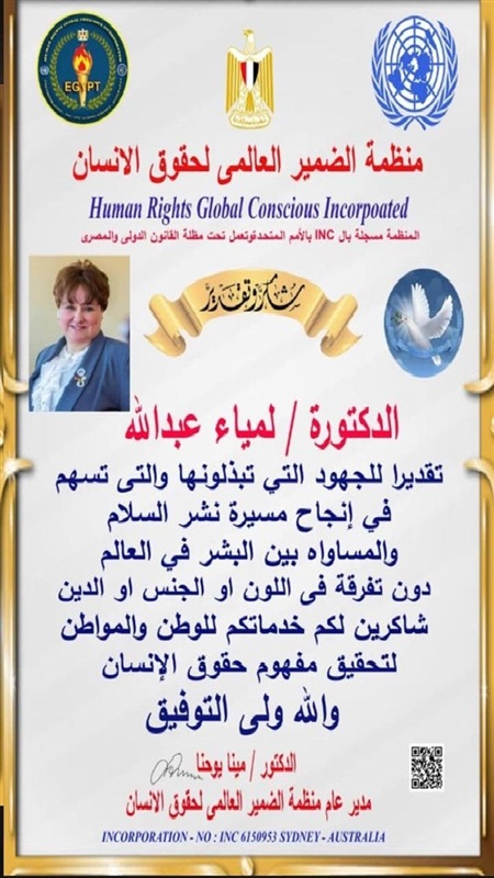 الضمير العالمي لحقوق الإنسان يُكرم الدكتورة "لمياء عبدالله"