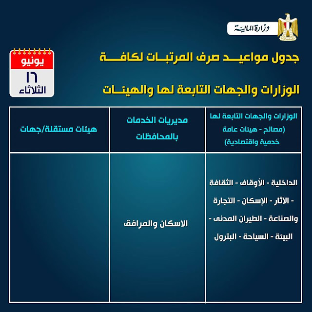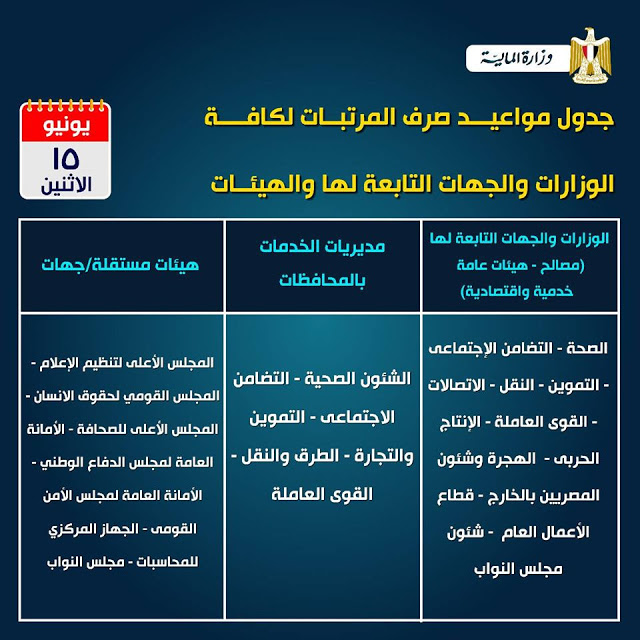 وقال عماد عواد رئيس قطاع الحسابات والمديريات المالية، إنه تم وضع مواعيد صرف مرتبات شهر يونيو لكل وزارة أو هيئة والجهات التابعة لها، بمراعاة عدد العاملين بها والمديريات التابعة لها بالمحافظات، مع تبكير مواعيد الصرف لكل الجهات وفى مقدمتها: مستحقات العاملين التابعين لوزارتي الصحة والداخلية؛ تقديرًا لجهودهم في مواجهة فيروس كورونا المستجد، حيث تقرر بدء صرف مرتبات العاملين في ١٧ وزارة وهيئة يوم ١٥ يونيو، ثم بدء صرف مرتبات ١٠ وزارات يوم ١٦ يونيو، ثم بدء صرف مرتبات ١١ وزارة وهيئة يوم ١٧ يونيه، ثم بدء صرف مرتبات ٩ وزارات وهيئات يوم ١٨ يونيو.