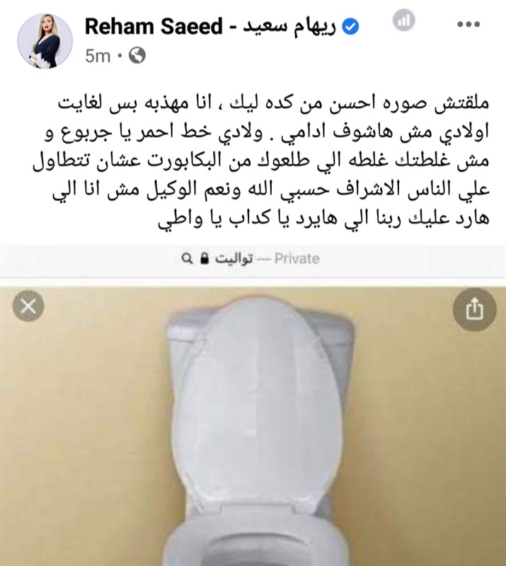 نشرت الإعلامية ريهام سعيد صورة تواليت تهاجم من خلاله أحد الفنانين الذين اشتبكت معهم مؤخرا وكتبت عبر حسابها الرسمي على موقع فيسبوك: «ملقتش صوره احسن من كده ليك، انا مهذبه بس لغايت اولادي مش هاشوف ادامي.. ولادي خط احمر يا جربوع و مش غلطتك.. غلطه الي طلعوك من البكابورت عشان تتطاول علي الناس الأشراف حسبي الله ونعم الوكيل مش انا الي هارد عليك ربنا الي هايرد يا كداب يا واطي”.