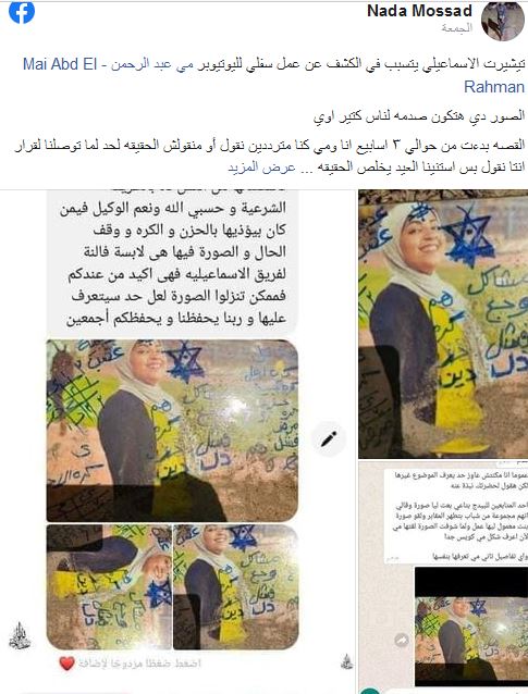 ودونت صديقة مي عبدالرحمن عبر حسابها الشخصي بموقع التواصل الاجتماعي «فيس بوك»، قائلة: «الصور دي هتكون صدمة لناس كتير أوي، القصة بدأت من حوالي 3 أسابيع، أنا ومي كنا مترددين نقول أو منقولش، الحقيقة لحد لما توصلنا لقرار نقول بس استنينا العيد يخلص، الحقيقة من حوالي 3 أسابيع مسدج اتبعتت على صفحة على فيس بوك فيها صورة ومسدج مع الصورة مكتوب فيها إن كان فيه حمله تطهير للمقابر من الأعمال المدفونة في مدينة أبو كبير محافظة الشرقية».