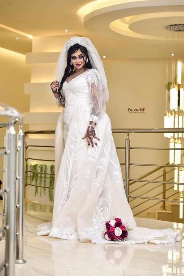 بدأ الحفل بتواجد العروس إلى جوار عريسها لعقد القران، وظهرت بفستان زفاف أبيض، واضعةً الحناء على يديها، وفضلت ترك شعرها منسدلًا على كتفيها، وبيدها باقة ورود باللونين الأبيض والأحمر، إذ خضعت لجلسة تصوير شاركت عددًا من صورها عبر حسابها الرسمي على «فيسبوك».