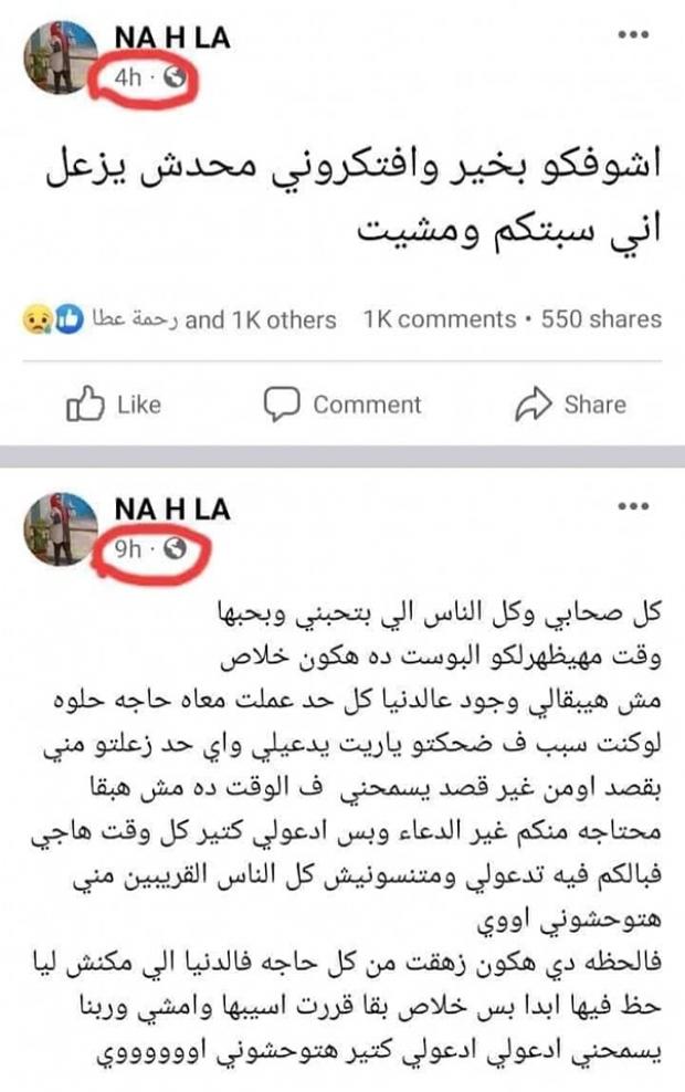 وبعد حوالي 5 ساعات من كتابة هذا المنشور، كتبت «نهلة» منشورًا آخر تؤكد إقدامها على الانتحار، قائلة: «أشوفكم بخير، وافتكروني، محدش يزعل إني سبتكم ومشيت».