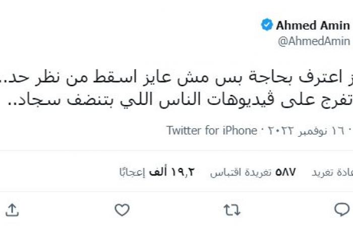 أثار الفنان احمد امين جدلًا واسعًا عبر مواقع بعد ما نشر تغريدة عبر موقع التواصل الاجتماعي “تيوتر” يعترف فيها بحبها لفيديوهات تنظيف السجاجيد قائلًا: