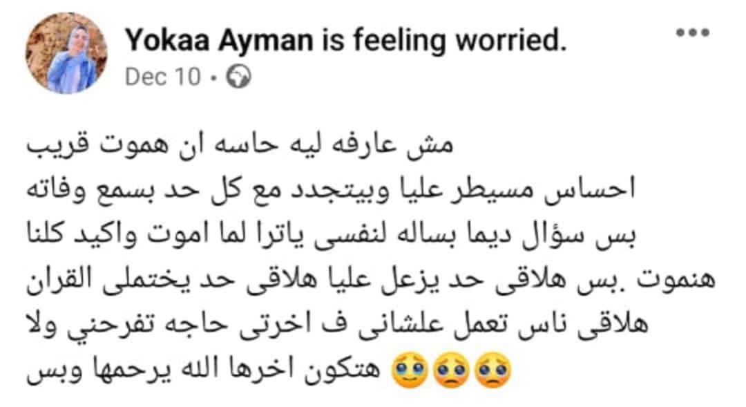 كتبت: "مش عارفة ليه حاسة إني هموت قريب، إحساس مسيطر عليا وبيتجدد مع كل حد بسمع خبر وفاته، بس سؤال دايمًا بسأله لنفسي، لما أموت وأكيد كلنا هنموت، هلاقي حد يزعل عليا، هلاقي حد يختملي القرآن، هلاقي ناس تعمل علشاني في آخرتي حاجة تفرحني ولا هتكون آخرها الله يرحمها وبس".