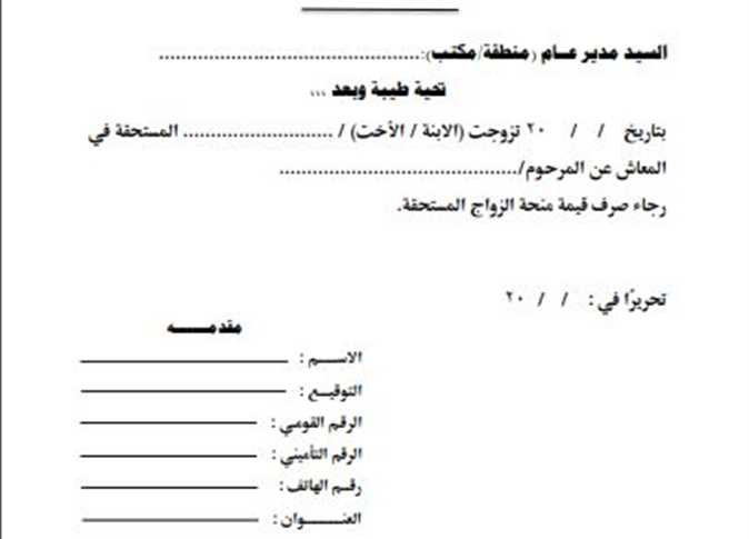 - طلب صرف منحة الزواج على حسب الأحوال، وذلك على النموذج رقم (8) المرفق.