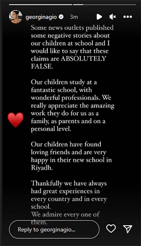 وكتبت جورجينا، عبر خاصية "ستوري" على حسابها على "إنستجرام": "بعض التقارير نشرت أخبارا سلبية عن وضع أبنائي في المدرسة، أود أن أنوه أنها أخبار غير صحيحة بالمرة، أطفالنا يدرسون في مدرسة رائعة، ونقدر تماما العمل العظيم الذي يقدم لنا كعائلة وعلى المستوى الشخصي".