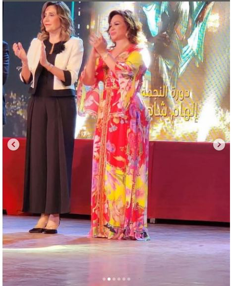 تألقت إلهام شاهين في الصور بإطلالة ملفتة، حيث ارتدت فستان طويل ذا أكمام طويلة واتسم التصميم بالألوان المبهجة التي زادت من أناقتها.