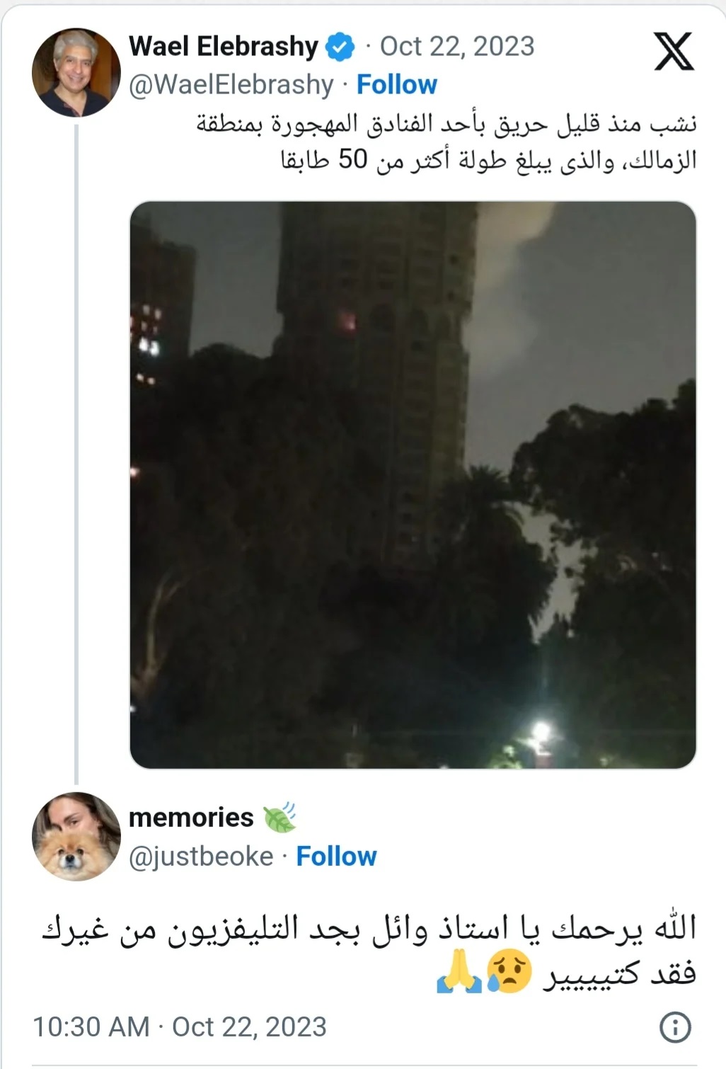 نشر حساب موثق باسم الإعلامي الراحل وائل الابراشي، تغريدة جديدة لخبر عن حريق بأحد الفنادق المهجورة في منطقة الزمالك بالقاهرة.
