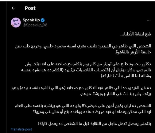 فيما قدمت صفحة "اتكلمي - SPEAK UP" بلاغًا لنقابة الأطباء ونص البوست: “الشخص اللي ظاهر في الفيديو: طبيب بشري اسمه محمود حلمي، وخريج طب بنين جامعة الأزهر بالقاهرة. دكتور محمود طلع على تويتر من كام يوم يتكلم مع صاحبه على أنه بيتحـ.ـرش بالمرضى، وكان بيقول أن إعْتصـــاب القاصـرات بيثــيره (الكلام ده هو نشره بنفسه وشاله لما الناس بدأت تشاركه) ده غير الفيديو ده اللي ظاهر فيه الدكتور مع صحابه (هو اللي ناشره بنفسه برده) وهو بيتحـ.ــرش ببنـــات في الشارع وبيشتـــموهم. الشخص ده إزاي يكون أمين على مرضى؟!! ولو ده اللي هو بينشره بنفسه على العام إيه اللي ممكن يعمله لو فيه مريضه عنده وواخده بنج أو مش في وعيها؟ بنتمنى يحصل تدخل عاجل من النقابة قبل ما الشخص ده يعمل كارثة”.