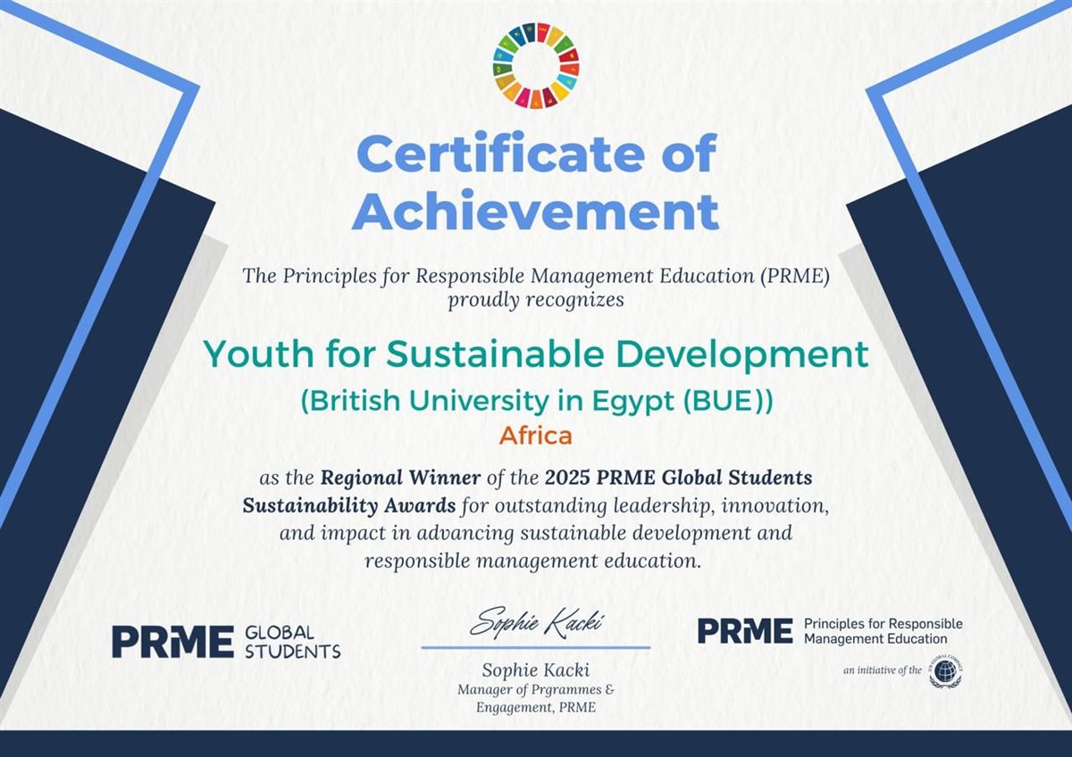 يأتي ذلك في إطار الجهود المستمرة للجامعة البريطانية في مصر في تعزيز الوعي بقضايا الاستدامة والمساهمة في تحقيق أهداف الأمم المتحدة للتنمية المستدامة (SDGs)، وتقديرًا للقيادة المتميزة، والابتكار، والتأثير الإيجابي الذي أحدثته المبادرة في تعزيز التنمية المستدامة وتعليم الإدارة المسؤول.