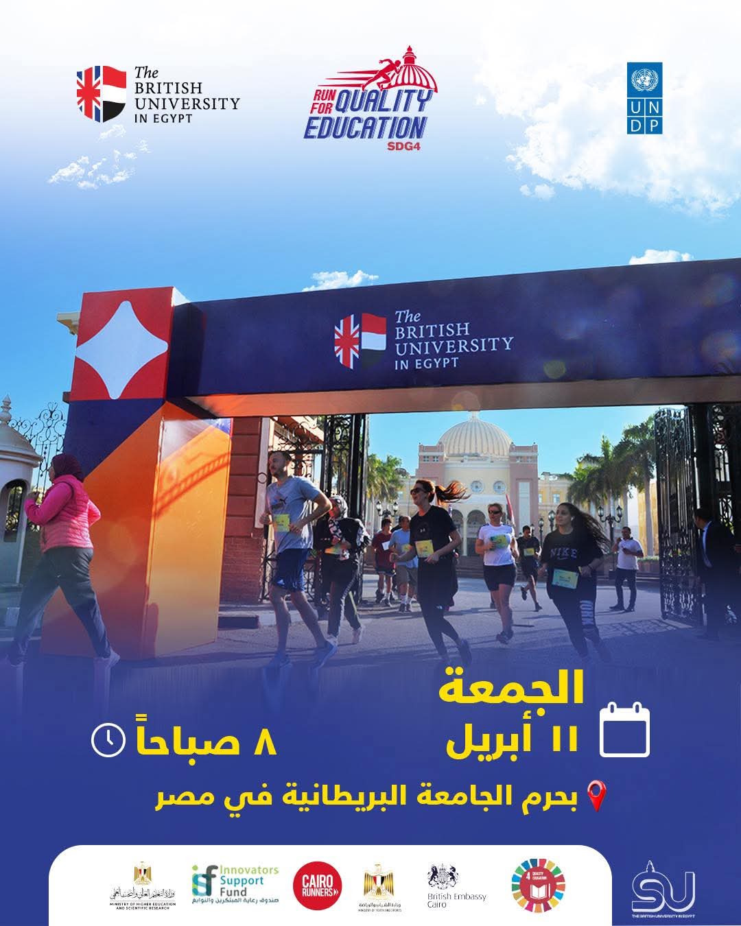 تنظم الجامعة البريطانية في مصر، برئاسة الدكتور محمد لطفي، رئيس الجامعة، أكبر ماراثون جامعي من أجل التعليم المتميز تحت شعار “Run For Quality Education” تحت رعاية وزارتي التعليم العالي والبحث العلمي، والشباب والرياضة، والسفارة البريطانية في القاهرة، وبالشراكة مع صندوق رعاية المبتكرين والنوابغ، وبحضور ومشاركة الدكتور أيمن عاشور، وزير التعليم العالي والبحث العلمي، والدكتور أشرف صبحي، وزير الشباب والرياضة، بالتعاون مع برنامج الأمم المتحدة الإنمائي.