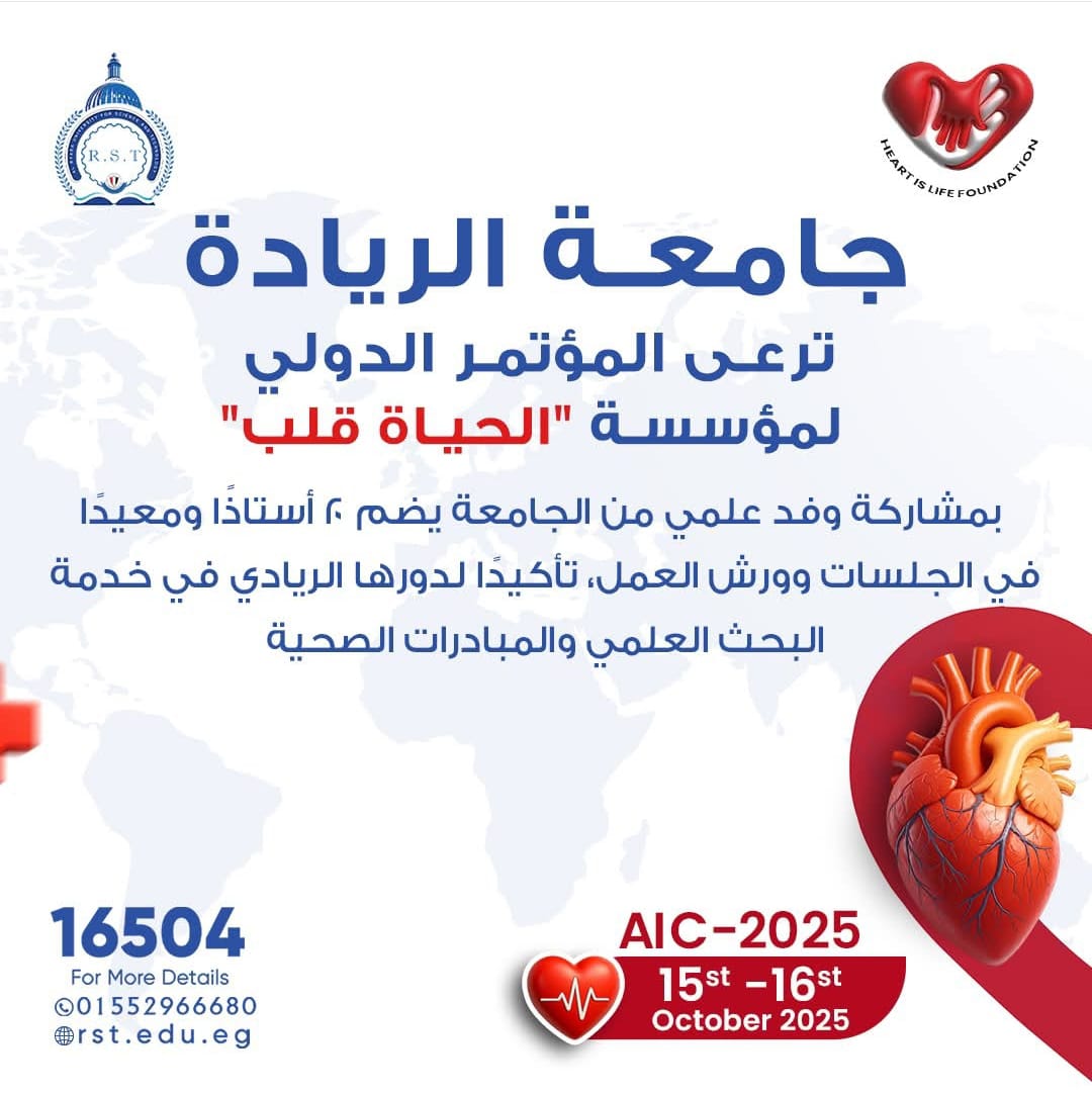 اعلنت جامعة الريادة للعلوم والتكنولوجيا دعم ورعاية المؤتمر الدولي السنوي لمؤسسة الحياة قلب والذي تنظمه يومي 15 و16 أكتوبر 2025 بالقاهرة وتشارك الجامعة بوفد علمي يضم 20 عضوًا من الأساتذة وأعضاء هيئة التدريس والهيئة المعاونة للمشاركة في الجلسات العلمية وورش العمل، بما يعكس حرصها على دعم المبادرات الصحية ويعزز من دورها كمؤسسة تعليمية رائدة في خدمة الإنسان.