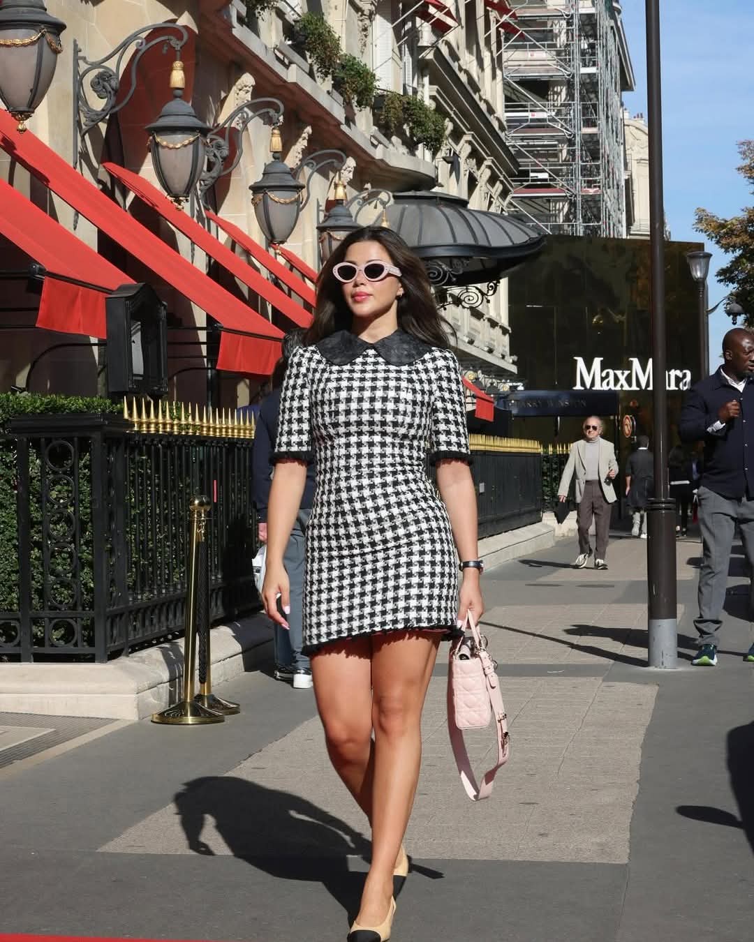 تألقت يارا بفستان قصير بنقشة الكاروه الشهيرة باللونين الأبيض والأسود، تميز بتصميم ضيق عند الخصر وأكمام قصيرة وياقة دائرية سوداء أضفت على الإطلالة طابعًا راقيًا يذكّر بموضة ستينات القرن الماضي.