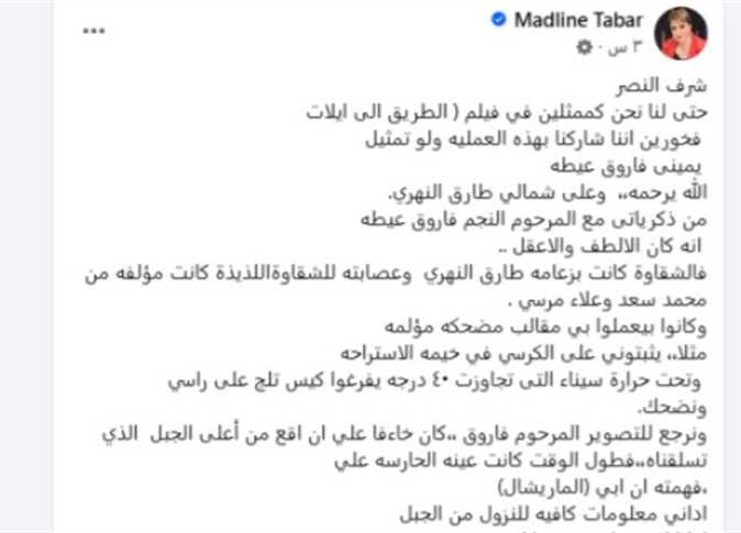 ونشرت صورة من الكواليس وكتبت عليها: «يميني فاروق عيطة الله يرحمه، وعلى شمالي طارق النهري.. من ذكرياتى مع المرحوم النجم فاروق عيطة أنه كان الألطف والأعقل، أما الشقاوة كانت بزعامة طارق النهري وعصابته للشقاوة اللذيذة كانت مؤلفة من محمد سعد وعلاء مرسي».