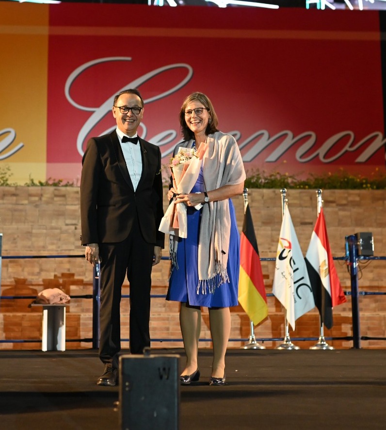 واختتمت كلمتها  بتوجيه رسالة نصح وحب للخريجين قائلة:" أنتم اليوم خريجوالجامعة الالمانية سفراء للتفاهم بين الثقافات، أراكم قادة المستقبل وباحثين ومبتكرين قادرين على الربط بين مصر وألمانيا، وبين العلوم والمجتمعات، قادرين على مواجهه القضايا المحلية والسعي لايجاد الحلول العالمية،  وبالنيابة عن الهيئة الألمانية للتبادل االعلمي، أتمنى لكم كل التوفيق في مساعيكم المقبلة، وأن تواصلوا دائمًا بناء الجسور واستخدام معارفكم لإحداث الأثر الإيجابي في حياة الآخرين. فاليوم نحتفل بنهاية مرحلة وبداية مستقبل واعد.