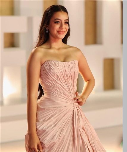 كما تألقت ياسمينا العبد بفستان من تصميم مرمر حليم أيضًا، وجاء بتصميم أنيق بفتحة جانبية طويلة ولون وردي هادئ يبرز نعومتها، مع مكياج ناعم وشعر منسدل على ظهرها. ويبلغ سعر الفستان حوالي 204 آلاف و758 جنيهًا.