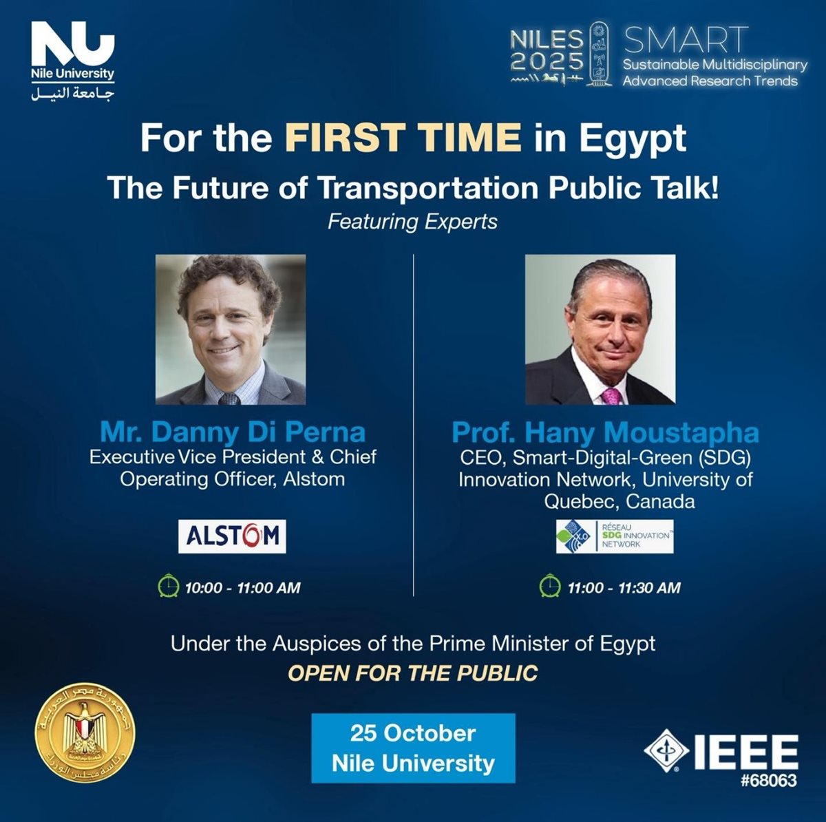 تستضيف جامعة النيل يوم السبت الموافق 25 أكتوبر الجاري الخبير العالمي السيد داني دي بيرنا، نائب الرئيس التنفيذي والرئيس التنفيذي للعمليات بشركة ألستوم الفرنسية، متحدثًا عن مستقبل النقل الذكي والمستدام في العالم، ومستعرضًا مشروع المونوريل المصري الوطني كنموذج رائد للبنية التحتية الذكية في الشرق الأوسط وأفريقيا، ودور الشراكات بين القطاعين العام والخاص في دعم منظومات النقل الحديثة منخفضة الانبعاثات، كما سيتناول التطورات التي تشهدها تكنولوجيا السكك الحديدية عالميًا، وأهمية تبني الحلول المبتكرة في تحقيق الاستدامة والنمو الاقتصادي.