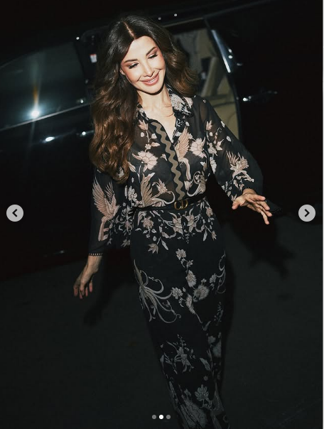 تألقت نانسي عجرم في الصور بإطلالة راقية، حيث ارتدت بنطلون وبلوزة باللون الأسود المزين بالنقوشات ذات اللون البيج.