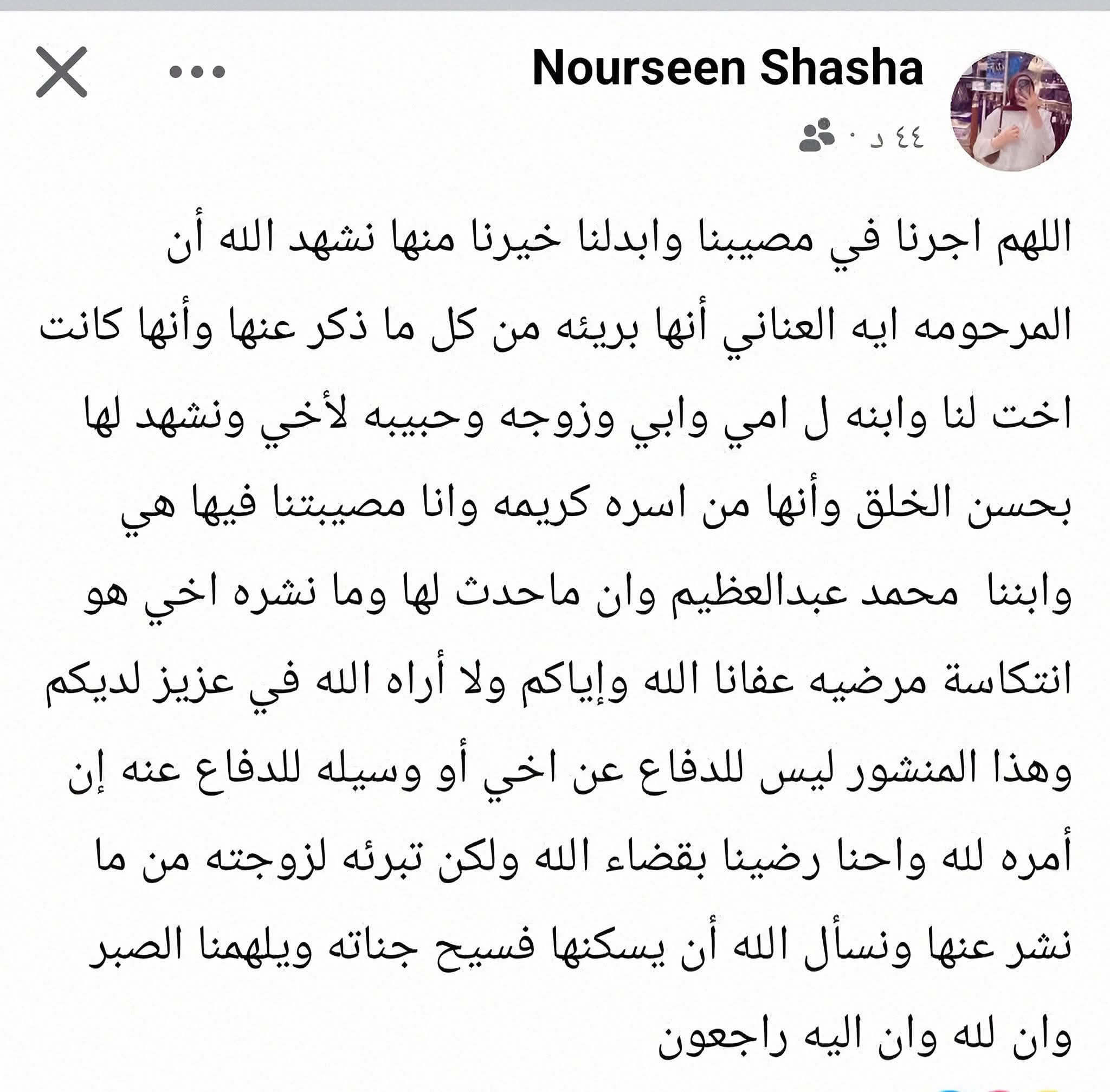 وقالت شقيقة الزوج في منشور علي موقع التواصل الاجتماعي الفيس بوك “ اللهم اجرنا في مصيبنا وابدلنا خيرنا منها نشهد الله أن المرحومه ايه العناني أنها بريئه من كل ما ذكر عنها وأنها كانت اخت لنا وابنه لامي وابي وزوجه وحبيبه لأخي ونشهد لها بحسن الخلق وأنها من اسره كريمه وان مصيبتنا فيها هي وابننا محمد عبد العظيم وان ما حدث لها وما نشره اخي هو انتكاسة مرضيه عفانا الله وإياكم ولا أراه الله في عزيز لديكم وهذا المنشور ليس للدفاع عن اخي أو وسيله للدفاع عنه إن أمره لله واحنا رضينا بقضاء الله ولكن تبرئه لزوجته من ما نشر عنها ونسأل الله أن يسكنها فسيح جناته ويلهمنا الصبر وان لله وان اليه راجعون”.