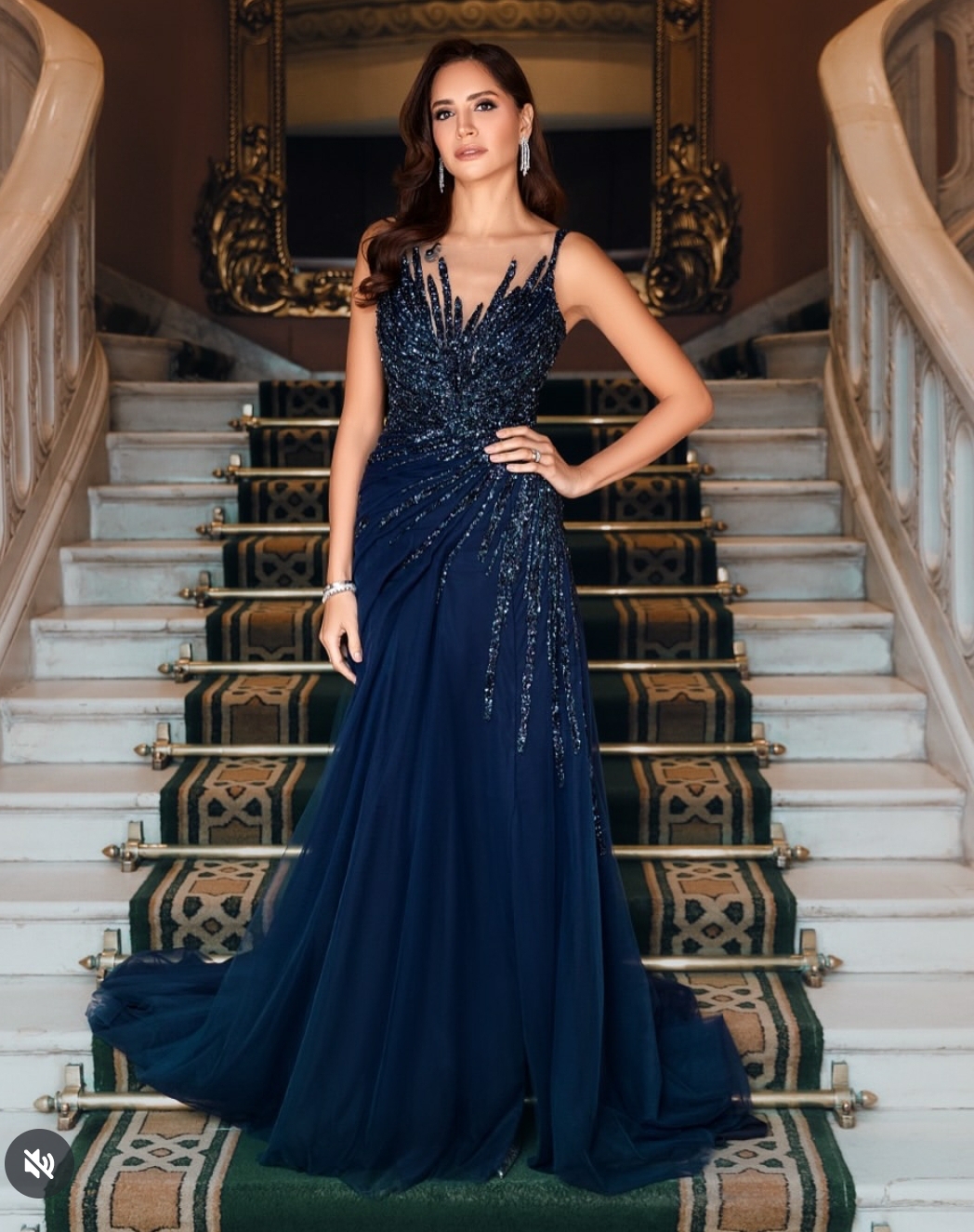 تألقت أمال ماهر في الصور بإطلالة راقية، حيث ارتدت فستان طويل ذا أكمام مكشوفة باللون الكحلي المصنوع من القماش المطرز.