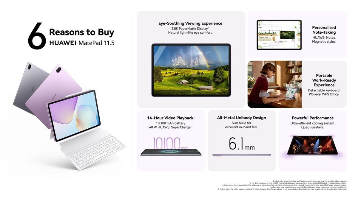 كما يقدم الجهاز شاشة PaperMatte التي تمنح تجربة كتابة ورسم طبيعية، مع تقليل البصمات، لتجربة قراءة وملاحظات مريحة. ومع تطبيق HUAWEI Notes، يمكن للمستخدمين تدوين الأفكار على الفور، التعليق على المستندات، وتنظيم الملاحظات بسهولة، مما يعزز الإبداع والإنتاجية.