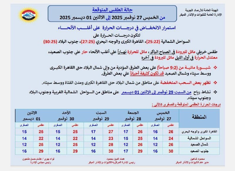تشير توقعات الخبراء إلى استمرار الانخفاض في درجات الحرارة على معظم المناطق، حيث تتراوح العظمى على السواحل الشمالية بين (25 – 22 درجة)، بينما تسجل القاهرة الكبرى والوجه البحري بين (27 – 25 درجة)، وتبقى جنوب البلاد أكثر حرارة بمعدلات تتراوح بين (30 – 25 درجة).