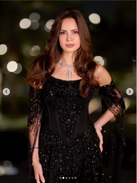 تألقت أمال ماهر في الصور بإطلالة راقية، حيث ارتدت فستان طويل مصنوع من القماش الأسود المطرز بالكامل مما زاد من أناقتها.