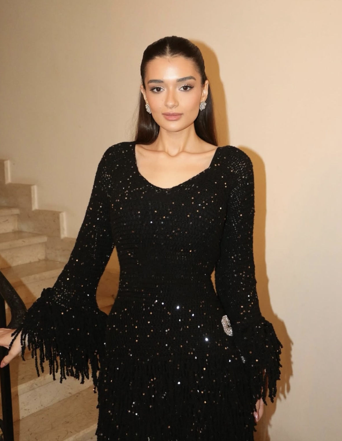 وظهرت ملك مرتدية فستانًا قصيرًا باللون الأسود، اتسم بتصميم مزين بتفاصيل لامعة، مع أطراف مزخرفة من الخيوط المتدلية.
