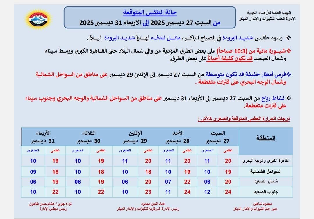 بيان تحذيري من الأرصاد.. حالة الطقس اليوم السبت 27-12-2025