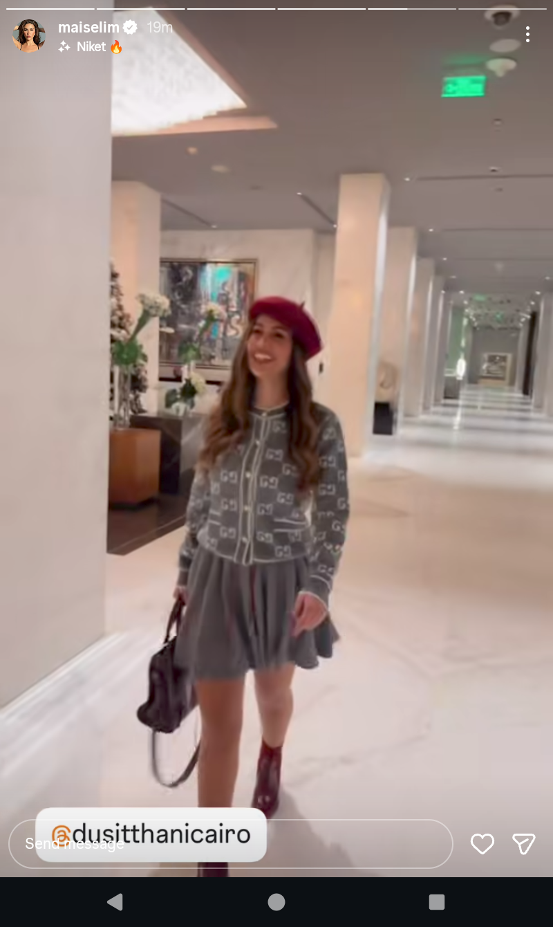 ومن الناحية الجمالية تعتمد على وضع الماكياج بلمسات بسيطة من الألوان الهادئة، تاركة خصلات شعرها منسدلة على كتفيها.