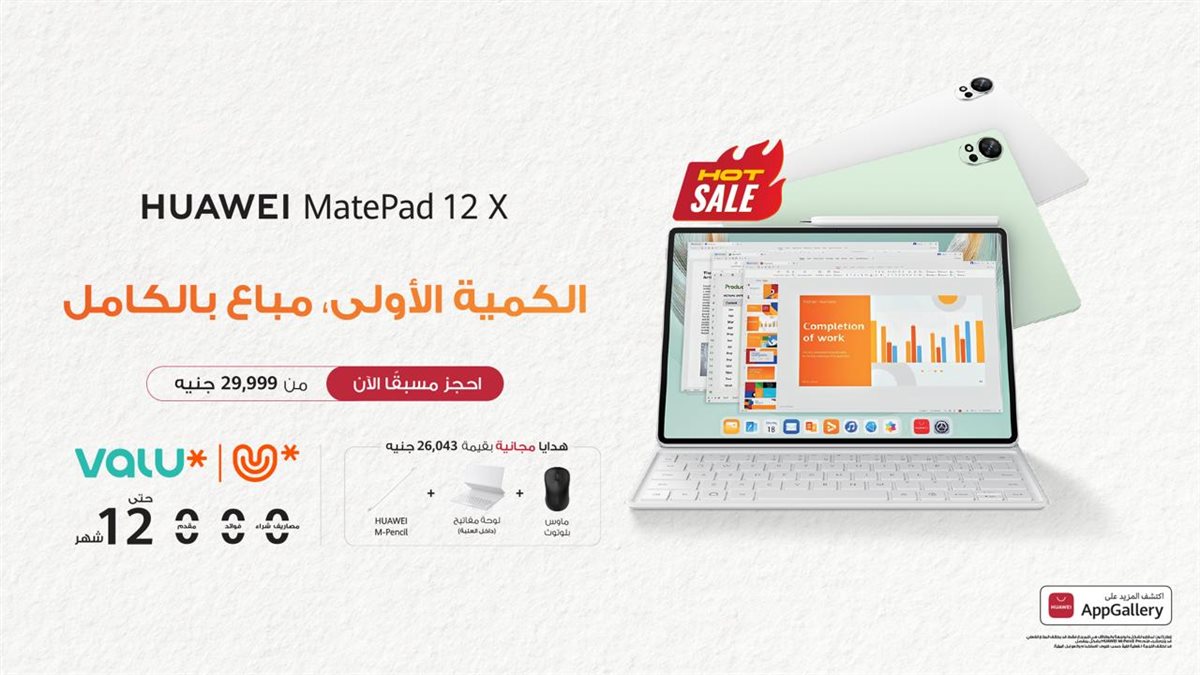 ولتعزيز سهولة الوصول، يمكن للمستخدمين الآن الحجز المسبق على جهاز HUAWEI MatePad 12 X بسعر يبدأ من 29،999 جنيه مصري لنسخة standard screen. ويُمكن للعملاء الحجز المسبق مع شركة ڤاليو بدون فوائد وبدون مقدم، مع خطط سداد مرنة تصل إلى 12 شهرًا. ويتوفر هذا العرض من خلال متاجر هواوي الرسمية، والمتجر الإلكتروني، وعدد من الموزعين المعتمدين.