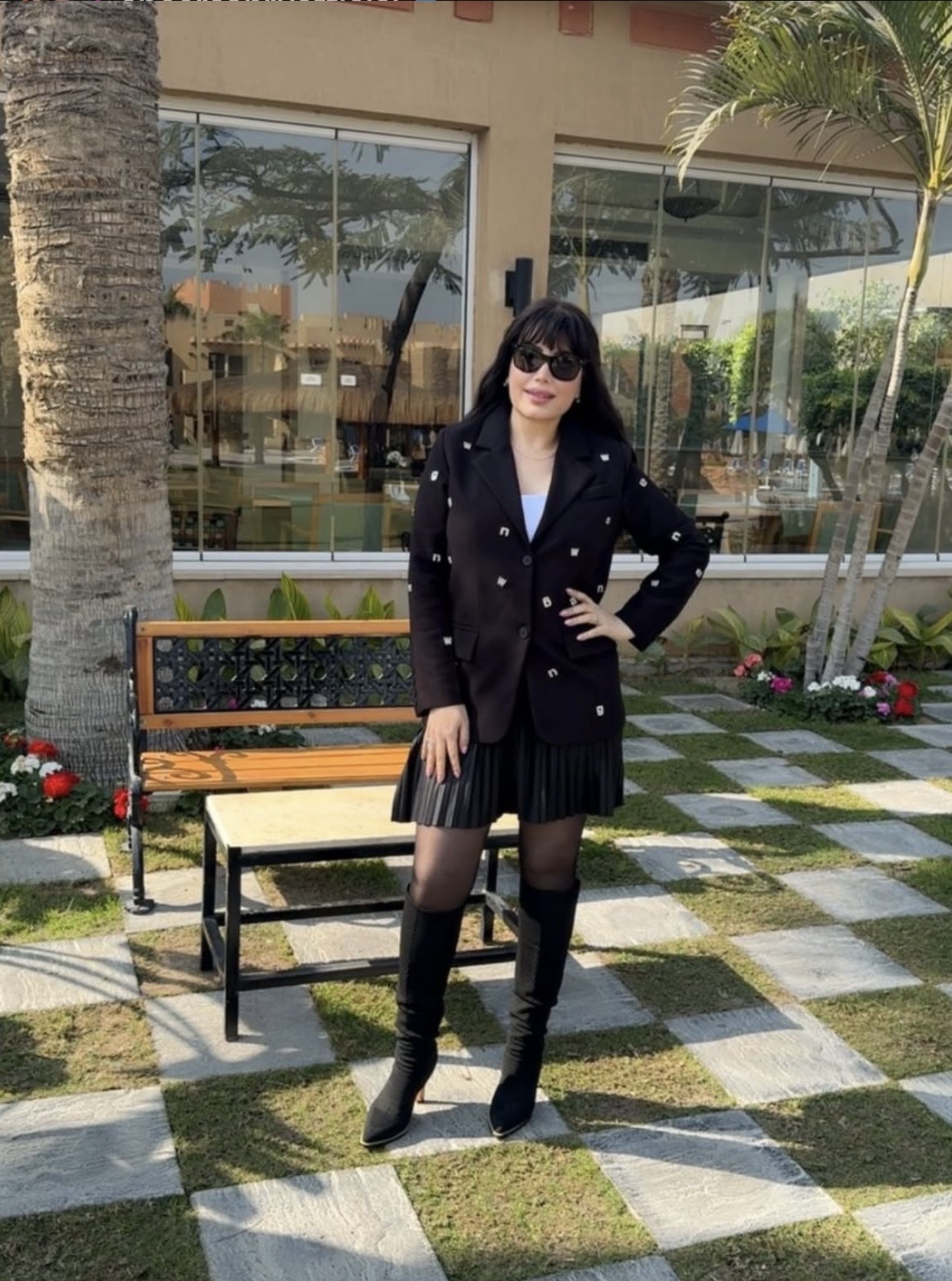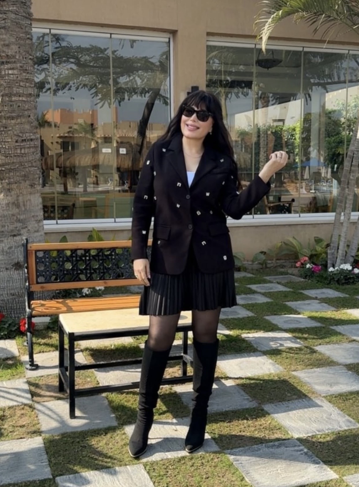 واعتمدت عبير على الجوارب السوداء مع بوت طويل باللون الأسود، بينما اختارت نظارة شمسية سوداء أضافت لمسة من الغموض والأناقة.