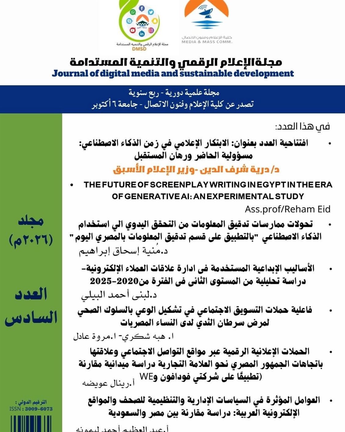 صدور العدد السادس من مجلة «الإعلام الرقمي والتنمية المستدامة» بكلية الإعلام وفنون الاتصال بجامعة 6 أكتوبر
