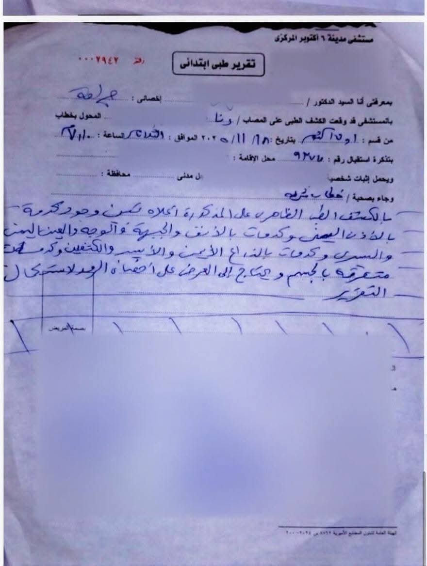 وكشف التقرير الطبي أن رنا طارق تعرضت لإصابات متعددة نتيجة الضرب والسحل، شملت الكدمات في الأنف والجبهة والذراع والعين اليسرى، الأمر الذي استدعى نقلها إلى المستشفى وعرضها على أخصائي رمد لتقييم حالتها الصحية.