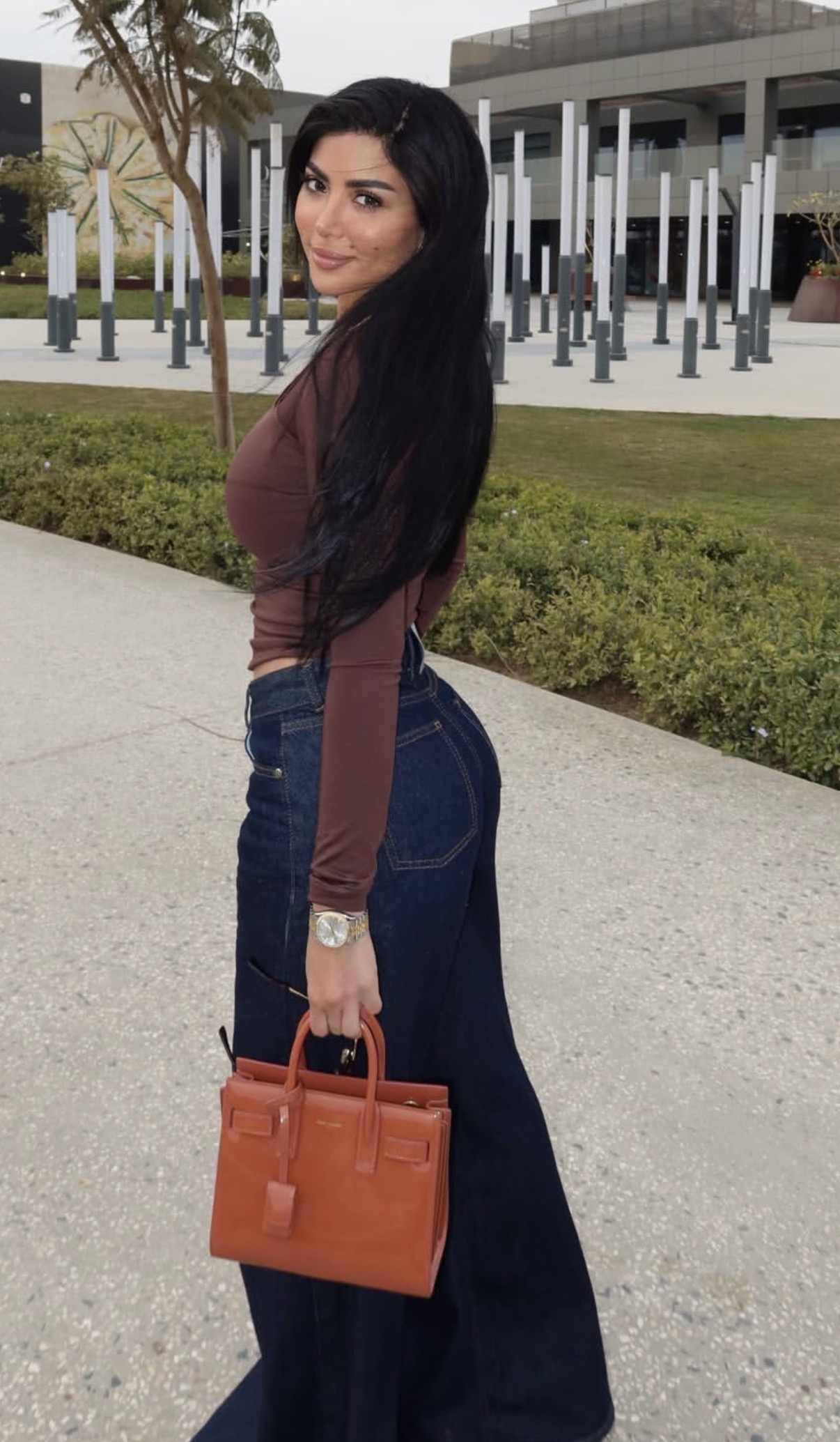 تألقت كارولين عزمي في الصور بإطلالة كاجوال، حيث ارتدت بنطلون چينز غامق مع توب ذا أكمام طويلة باللون البني الذي لا يحمل أي نقوشات أو تطريزات.