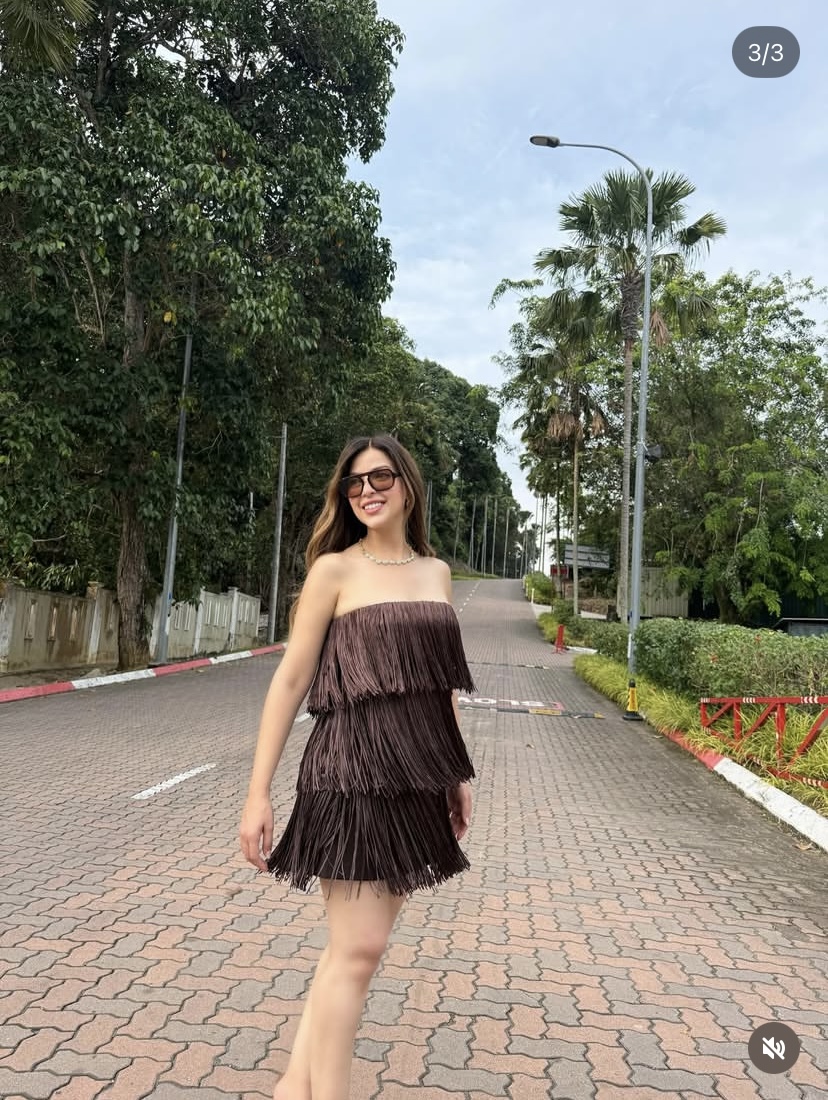 ونشرت ميرنا صورًا من رحلتها عبر حسابها الرسمي على موقع التواصل الاجتماعي "إنستجرام"، وظهرت بفستان صيفي جريء بقصة "الشراشيب"، مع مكياج هادئ باللون البني.