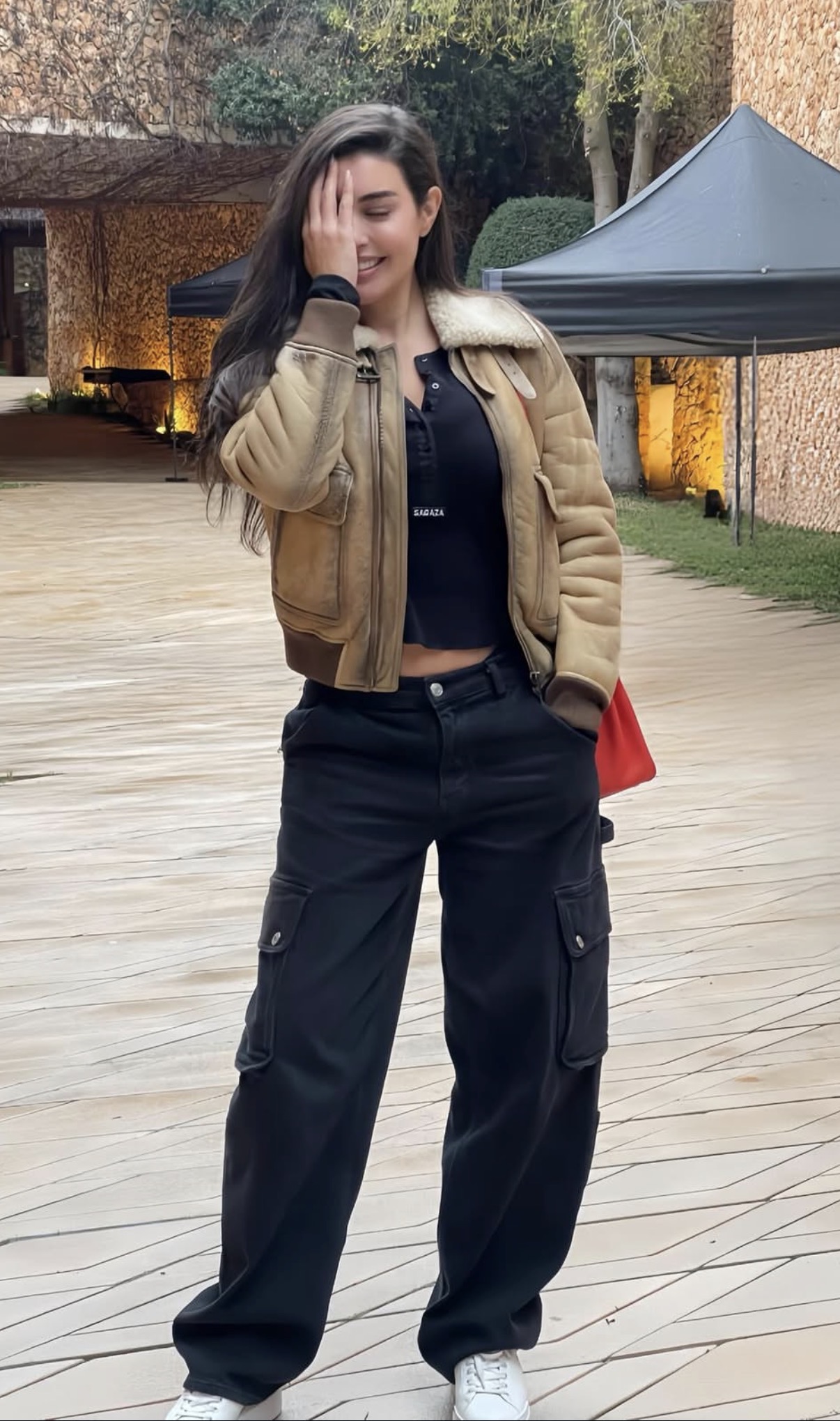 تألقت ياسمين صبري في الصور بإطلالة كاجوال، حيث ارتدت بنطلون باللون الأسود مع توب بنفس اللون كشف عن بطنها، ونسقت معهما جاكت بيج.