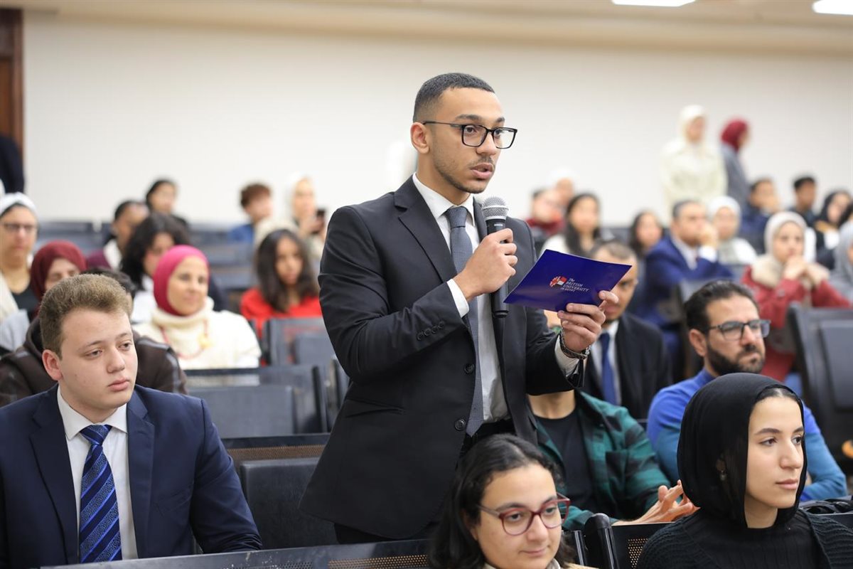 جاء ذلك بحضور السفير مارك برايسون ريتشاردسون، السفير البريطاني لدى مصر، والأستاذ الدكتور أشرف صبحي، وزير الشباب والرياضة السابق وحضر الندوة أيضًا الأستاذ الدكتور يحيي بهي الدين، نائب رئيس الجامعة للبحوث والمشروعات، والأستاذ الدكتور جيمس جازارد، النائب الأكاديمي لرئيس الجامعة، والأستاذ الدكتور طارق عباس، نائب رئيس الجامعة للقطاع الطبي، والأستاذة الدكتورة ودودة بدران، نائب رئيس الجامعة للقطاع الأدبي، والأستاذة الدكتورة كاثرين هاربر، نائب رئيس الجامعة للحياة الطلابية، والأستاذ الدكتور إبراهيم سلامة، عميد كلية القانون، والأستاذة الدكتورة هادية فخر الدين، عميد كلية الاقتصاد والعلوم السياسية وإدارة الأعمال، والأستاذة الدكتورة أماني خضير، رئيس قسم العلوم السياسية ووكيل الكلية، وعدد من عمداء الكليات وأعضاء هيئة التدريس.