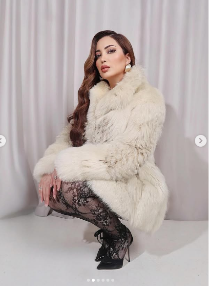 لفتت نسرين طافش الأنظار في الصور بإطلالة غير تقليدية، حيث ارتدت بالطو باللون البيج المصنوع الفرو ونسقت معه شراب طويل مصنوع من الدانتيل.