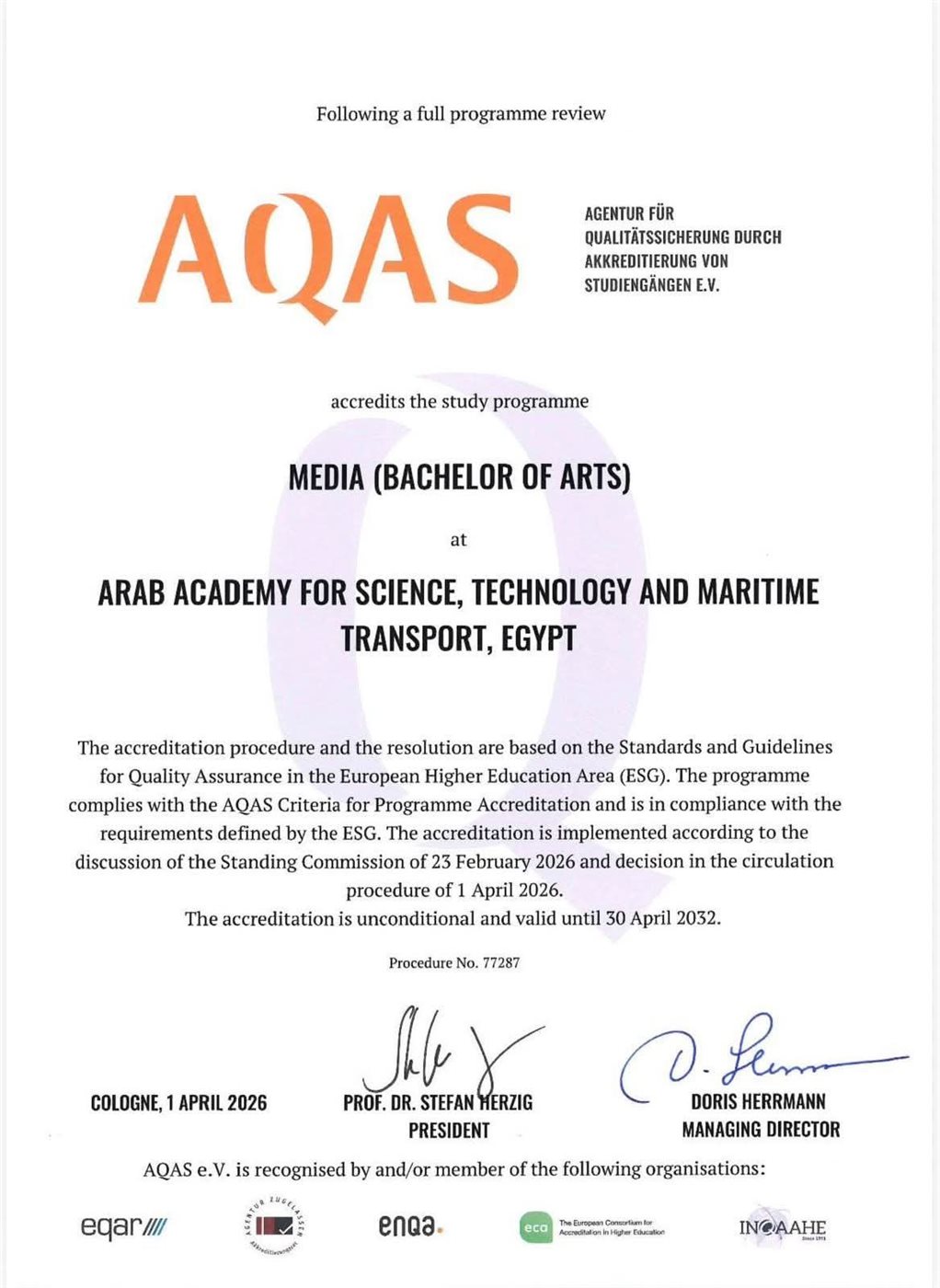 حققت الأكاديمية العربية للعلوم والتكنولوجيا والنقل البحري إنجازًا دوليًا جديدًا بحصول برنامج بكالوريوس الإعلام بكليات اللغة والإعلام -بالقاهرة والإسكندرية والقرية الذكيةـ على الاعتماد الدولي غير المشروط من هيئة "AQAS" الألمانية لضمان الجودة والاعتماد الأكاديمي، والممتد حتى عام 2032.