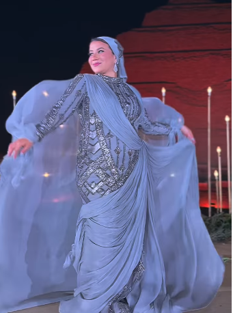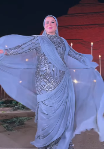 تألقت ابنة هبة قطب في الصور بإطلالة مميزة، حيث ارتدت فستان طويل ذا أكمام طويلة باللون الرمادي الفاتح الذي حمل بعض التطريزات الراقية والتي زادت من أناقتها.