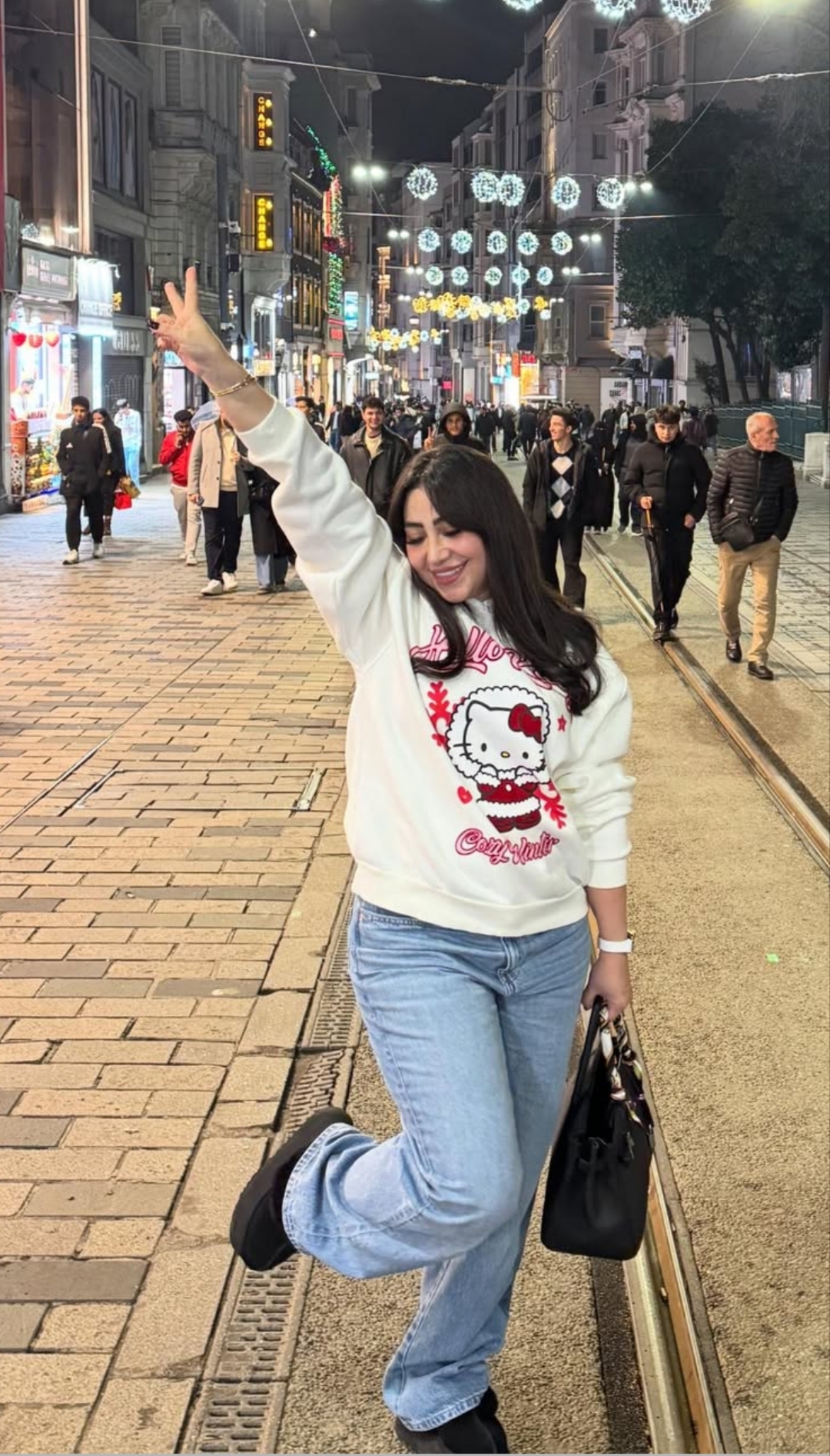 وظهرت بوسي، بإطلالة كاجوال مرتديه بنطال جينز واسع مع بلوفر باللون الابيض ليكشف عن جمالها ورشاقتها.