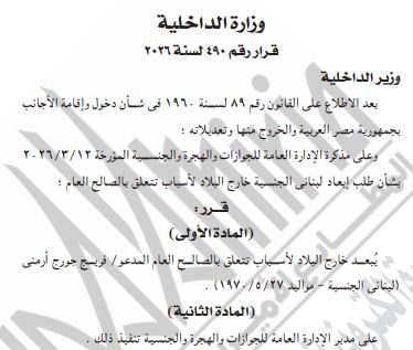 نص القرار، رقم 490 من العدد 81 لسنة 2026 بعد الاطلاع على القانون رقم 89 لسنة 1960 في شأن دخول وإقامة الأجانب في مصر والخروج منها وتعديلاته، وعلى مذكرة الإدارة العامة للجوازات والهجرة والجنسية المؤرخة 12/3/2026 بشأن طلب إبعاد لبناني الجنسية خارج البلاد لأسباب تتعلق بالصالح العام، بأن يبعد خارج البلاد لأسباب تتعلق بالصالح العام المدعو فريج جورج أرمني لبناني الجنسية مواليد 27/5/1970.