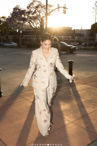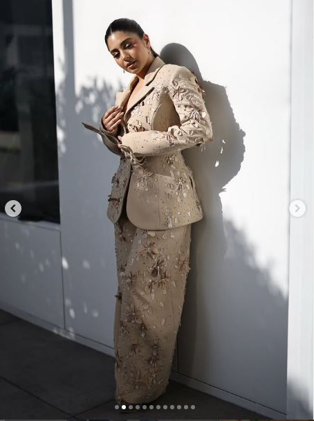 ظهرت مايان السيد بإطلالة غير تقليدية وغريبة، حيث ارتدت بليزر وبنطلون بنفس اللون البيج الذي حمل بعض التطريزات الملفتة للغاية.