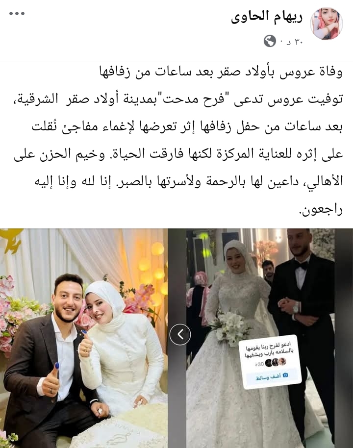 شهدت مدينة أولاد صقر بمحافظة الشرقية حالة من الحزن الشديد عقب وفاة العروس "فرح مدحت" وذلك بعد ساعات قليلة من انتهاء مراسم زفافها إثر تعرضها لأزمة قلبية  مفاجئة.